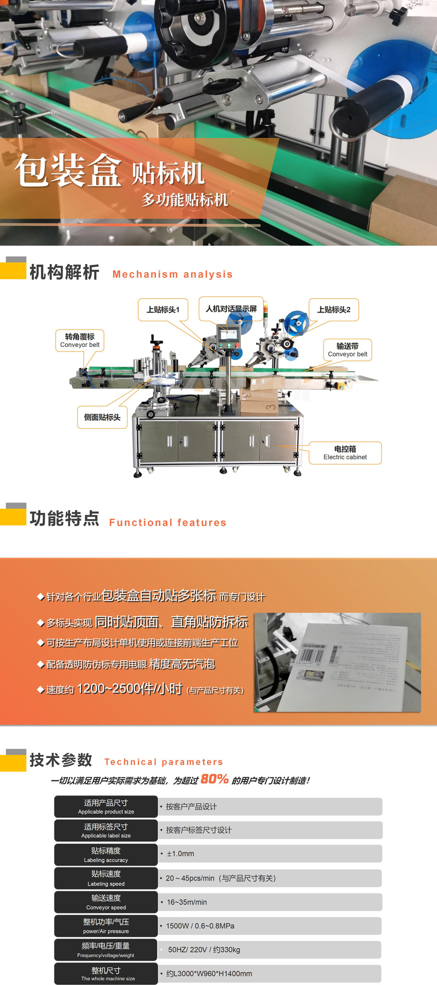 適用于在各種包裝盒的上平面+轉(zhuǎn)角+側(cè)面貼標簽或不干膠膜,實現(xiàn)多功能貼標一體化,本案例為濾芯器包裝盒貼標專屬訂制。