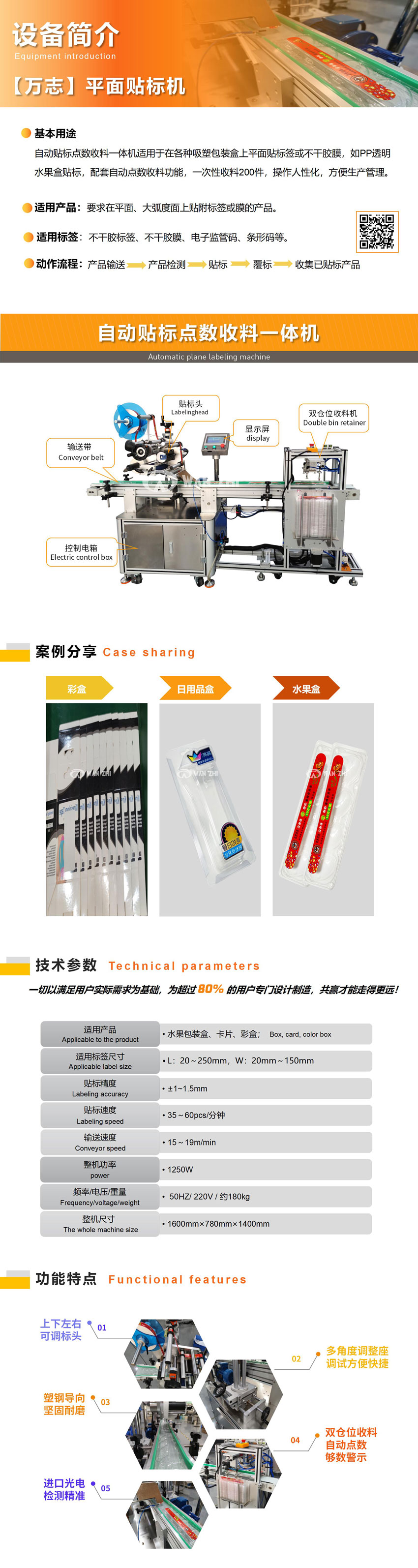 適用于在各種吸塑包裝盒上平面貼標(biāo)簽或不干膠膜,如PP透明水果盒貼標(biāo),配套自動點(diǎn)數(shù)收料功能,一次性收料200件,操作人性化,方便生產(chǎn)管理。