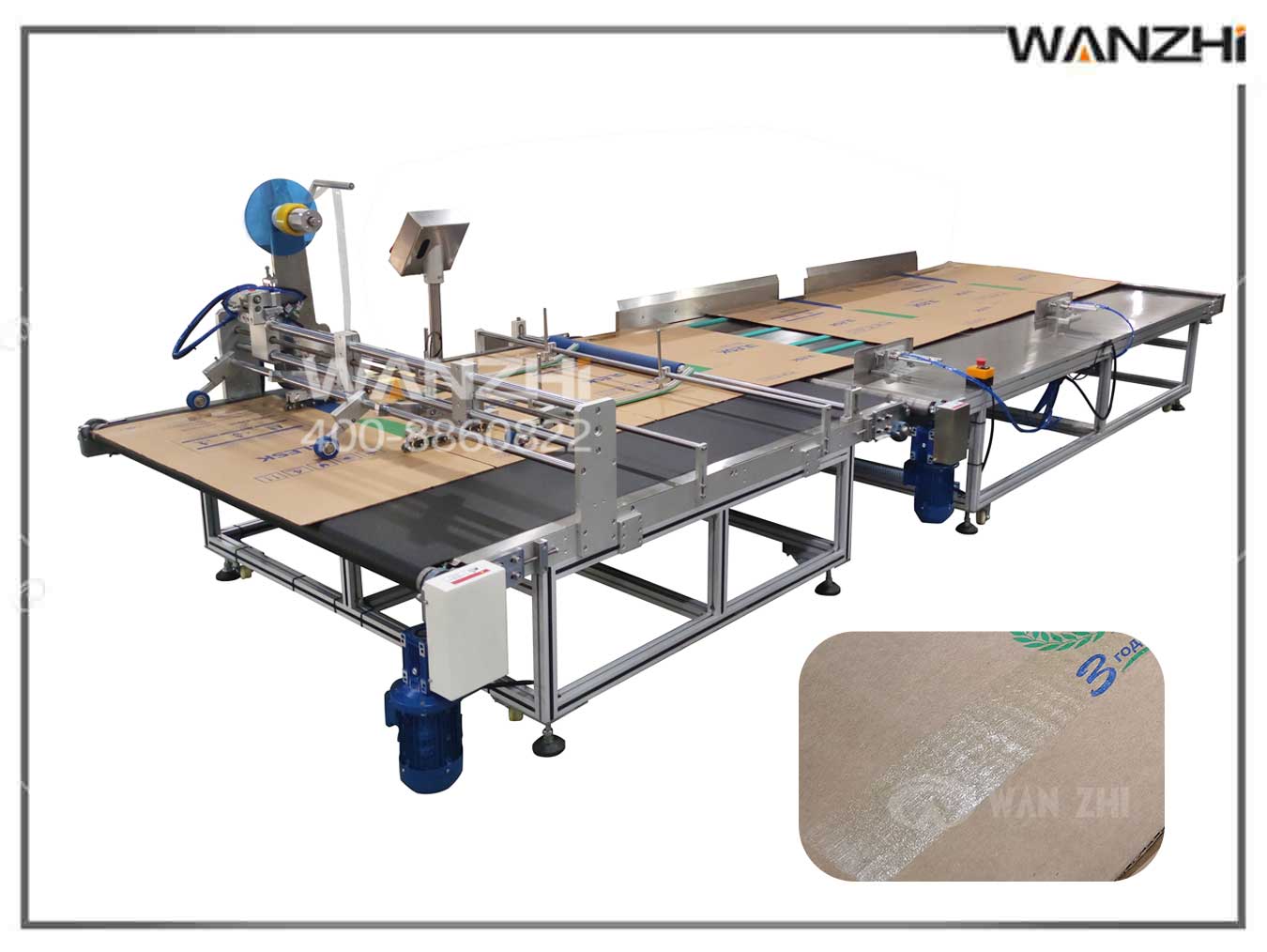 萬志作為一個(gè)具有10年研發(fā)歷史的包裝自動(dòng)化設(shè)備公司,應(yīng)市場(chǎng)所需及時(shí)研發(fā)推出一款自動(dòng)貼抗撕裂膠帶機(jī),可配套生產(chǎn)線。