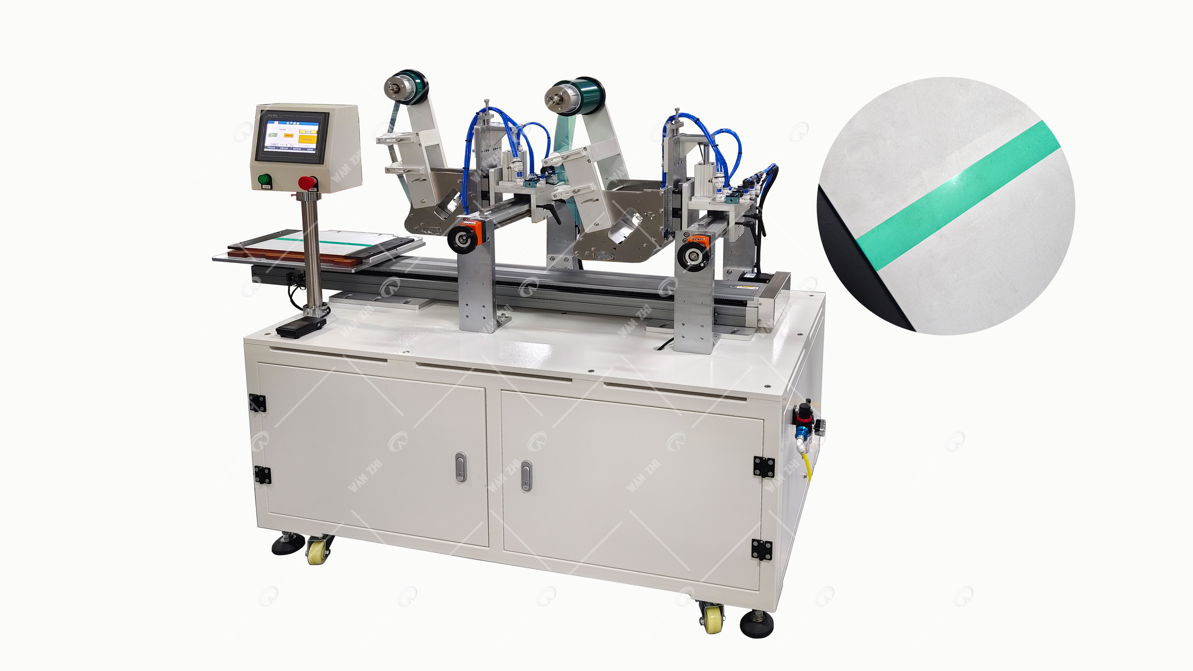 萬志自動(dòng)貼高溫膠帶機(jī)專為手提電腦、智能手機(jī)、平板電腦等精密電子產(chǎn)品的后蓋設(shè)計(jì),該機(jī)器能夠高效、精準(zhǔn)地完成高溫膠帶或3M膠帶的貼附工作,為產(chǎn)品提供穩(wěn)固的防護(hù)與美觀的裝飾。搭載先進(jìn)的自動(dòng)轉(zhuǎn)盤系統(tǒng),自動(dòng)貼高溫膠帶機(jī)實(shí)現(xiàn)了從原料放置到成品收集的全程自動(dòng)化,極大地簡化了操作流程,有效節(jié)省了人力成本。同時(shí),其自動(dòng)切膠功能讓膠帶長度隨心所欲,滿足不同產(chǎn)品的個(gè)性化需求。產(chǎn)品夾具則采用精密模組XY軸自動(dòng)輸送,確保每一次貼膠都精準(zhǔn)無誤,大大提升了生產(chǎn)效率和產(chǎn)品質(zhì)量。