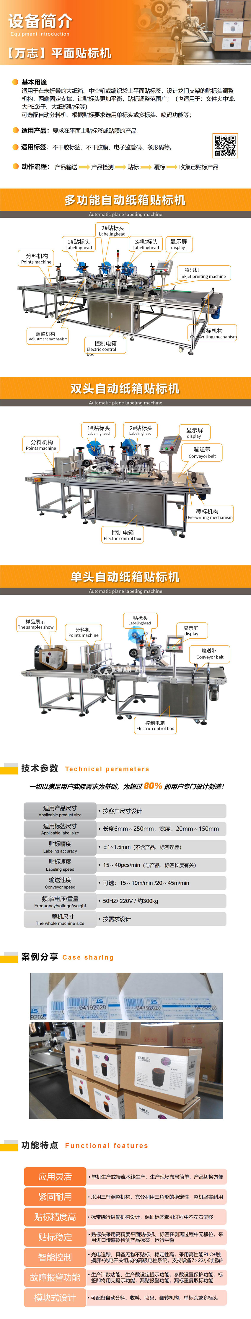 全自動紙箱貼標(biāo)機(jī)適用于在未折疊的大紙箱、中空箱或編織袋上平面貼不干膠標(biāo)簽,設(shè)計龍門支架的貼標(biāo)頭調(diào)整機(jī)構(gòu),兩端固定支撐,讓貼標(biāo)頭更加平衡,貼標(biāo)調(diào)整范圍廣,最大范圍到寬度為800mm紙箱;可根據(jù)貼標(biāo)要求做單標(biāo)頭、雙標(biāo)頭或多標(biāo)頭;可根據(jù)用戶需求配備自動分料機(jī)構(gòu)、收料機(jī)構(gòu)、翻轉(zhuǎn)機(jī)構(gòu)。(可同時應(yīng)用于:文件夾中鋒貼標(biāo)、大PE袋子貼標(biāo)、大紙板貼標(biāo)等)。