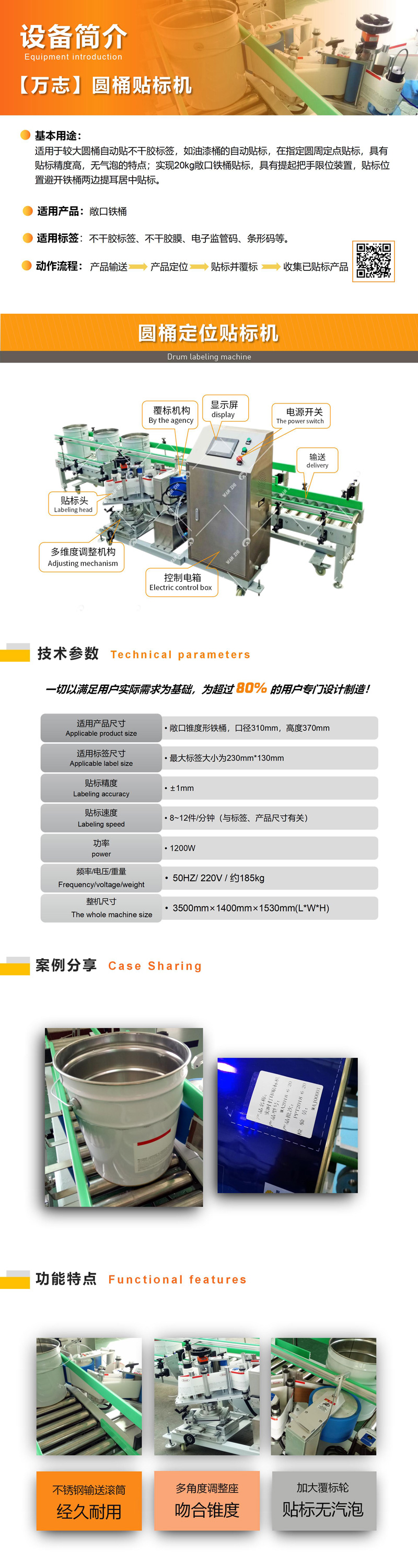 全自動(dòng)油漆桶貼標(biāo)機(jī)適用于油漆桶的自動(dòng)貼標(biāo),圓周定點(diǎn)貼標(biāo),具有貼標(biāo)精度高,無(wú)氣泡的特點(diǎn);實(shí)現(xiàn)20kg敞口鐵桶貼標(biāo),可實(shí)現(xiàn)定位貼標(biāo),具有提起把手限位裝置,貼標(biāo)位置避開鐵桶兩邊提耳居中貼標(biāo)。
