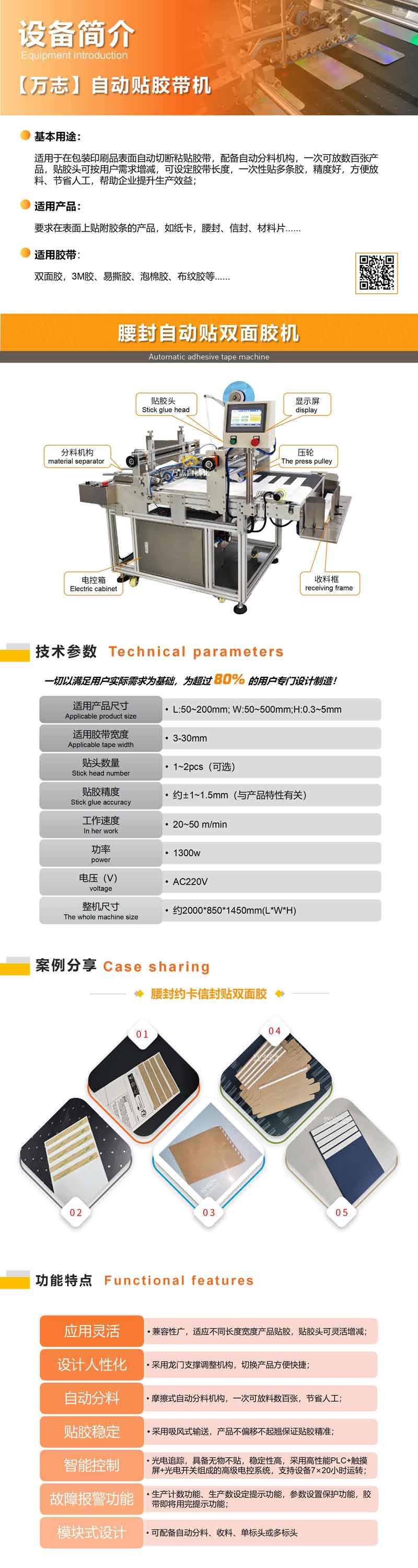 適用于在包裝印刷品表面自動切斷粘貼膠帶,配置備自動分料機構(gòu),一次可放數(shù)百張產(chǎn)品,貼膠頭可按用戶需求增減,可設(shè)定膠帶長度,一次性貼多條膠,精度好,方便放料、節(jié)省人工,幫助企業(yè)提升生產(chǎn) 益;