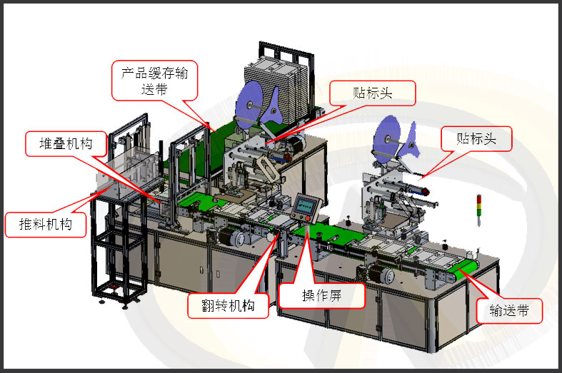 自動啟動——>人工放料 ——>1#標頭攔停產(chǎn)品貼標——>180度自動翻轉(zhuǎn)產(chǎn)品——>2#標頭攔停產(chǎn)品貼標——>產(chǎn)品堆疊——>推送推疊產(chǎn)品——>人工收料。