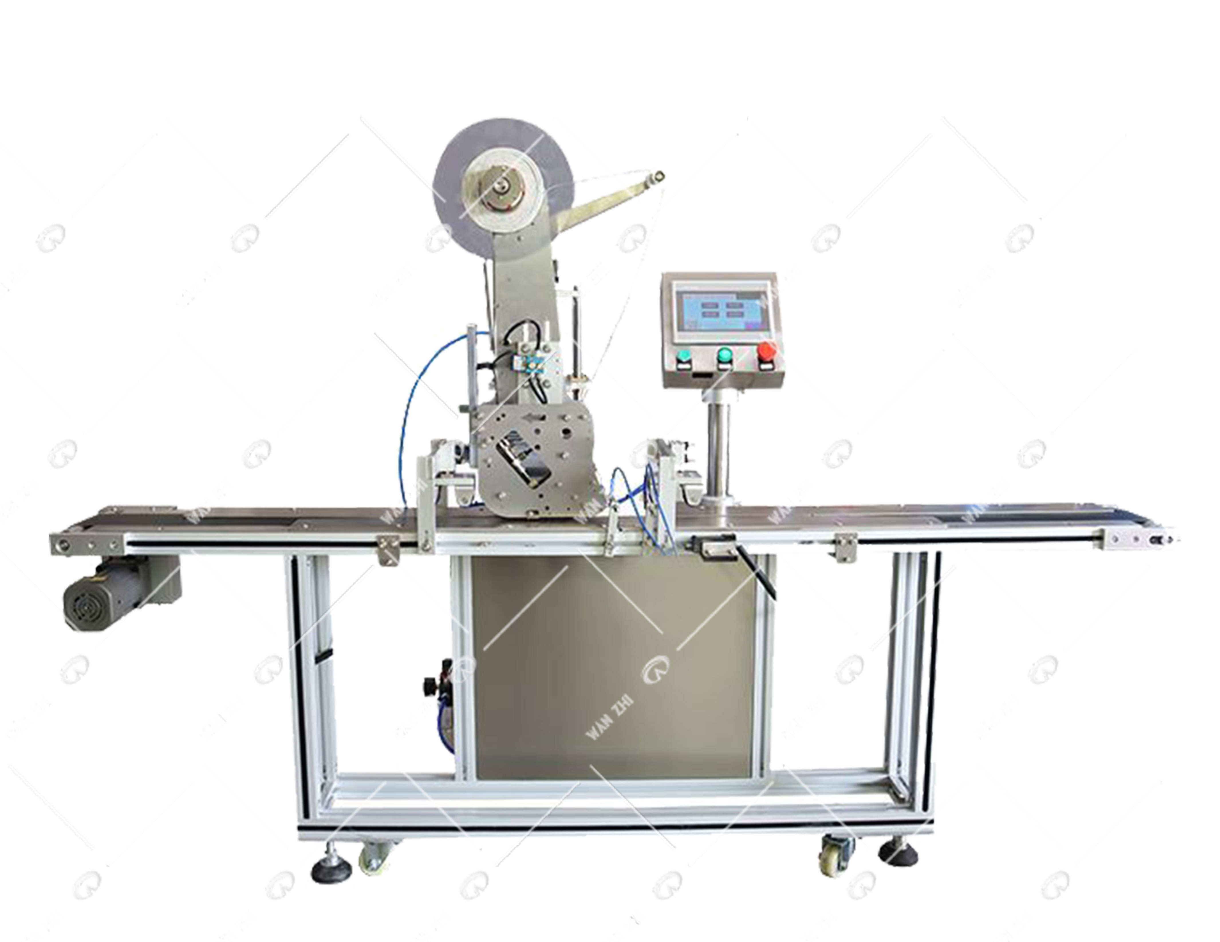 3、松下PLC控制,人機對話界面,參數(shù)觸屏設(shè)置,可在產(chǎn)品輸送方向同一水平位置貼一段式或多段式膠條,長度可以任意設(shè)定。