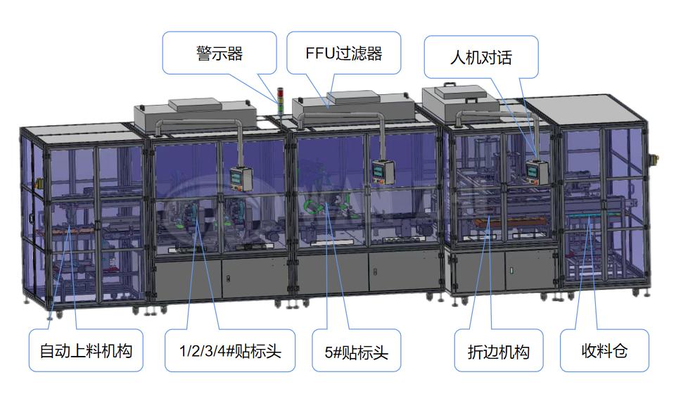 現(xiàn)場布局簡單,產(chǎn)品切換方便。整線包含自動上料機、貼標機、搬運模組、壓合折邊機、收料機。